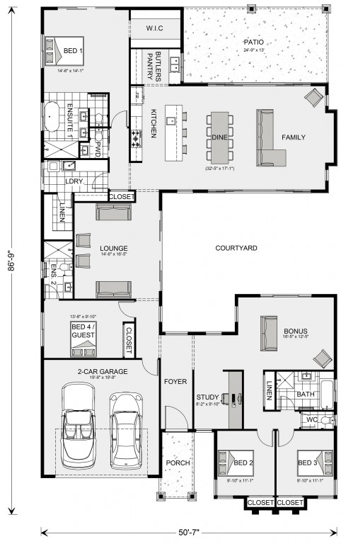 Looking for an open concept? The Mandalay was designed around the concept of open space flowing out to an inner courtyard to create the ultimate in Resort style LivingThree separate living zones wrap around a central courtyard allowing natural light and cooling cross breezes throughout the home. The gourmet kitchen including butler’s pantry, dining and family room flow out to a covered Alfresco area making entertaining a breeze. A private & luxurious Primary Suite with ensuite and Walk in Robe, 3 additional bedrooms with Activity, Study, family bathroom and a central open lounge room complete the picture. Enjoy all the comforts this great design brings and experience the home you always wished to have. Elegant form and perfect function, Mandalay Designs are a winning combination. As with any G.J. Gardner Home, we can customize this plan to suit your lifestyle. Contact one of our Design Centers today!