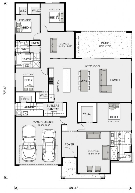 Combining elegant spatial flow and intelligent separation of private spaces the Vista design has all the features to meet modern family requirements with space for every member of the family. At the heart of the home is the perfect space for the family to come together and entertain guests, boasting an impressive open plan living area with kitchen, Dining and Family that opens outdoors onto a large covered Alfresco. Towards the rear of the home is the kids’ zone with bedrooms and family bathroom surrounding a central activity room. A master bedroom suite is privately positioned behind a separate lounge room to the front and is complemented by a well-appointed ensuite and walk in robe. As with any G.J. Gardner Home, we can customize this plan to suit your lifestyle. Contact one of our Design Centers today!